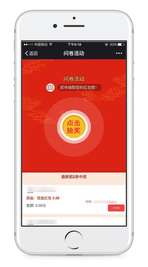 企业发展,时时刻刻都需要获取信息:市场/消费者/竟对/异业/潮流 等等,线上调查问卷无疑是一个最直接的工具。我们在普通问卷的基础上,开发出红包功能:当参与者提交问卷后,即可抽得一个现金红包,作为奖励。