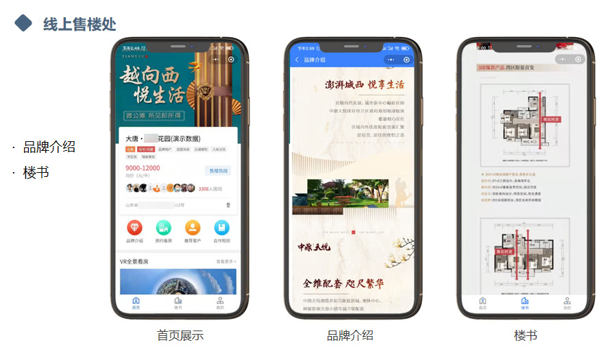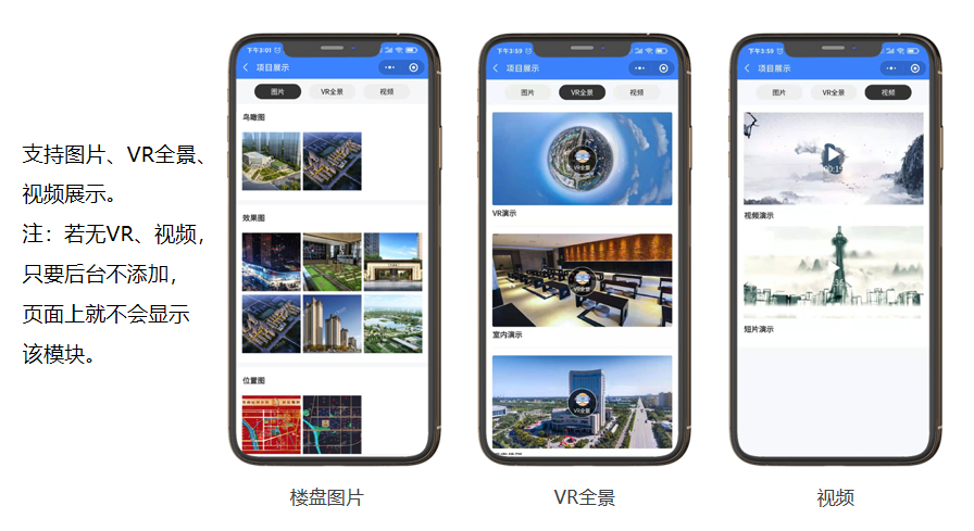 支持楼盘展示,微楼书,微沙盘,动态,图片,视频,VR等;